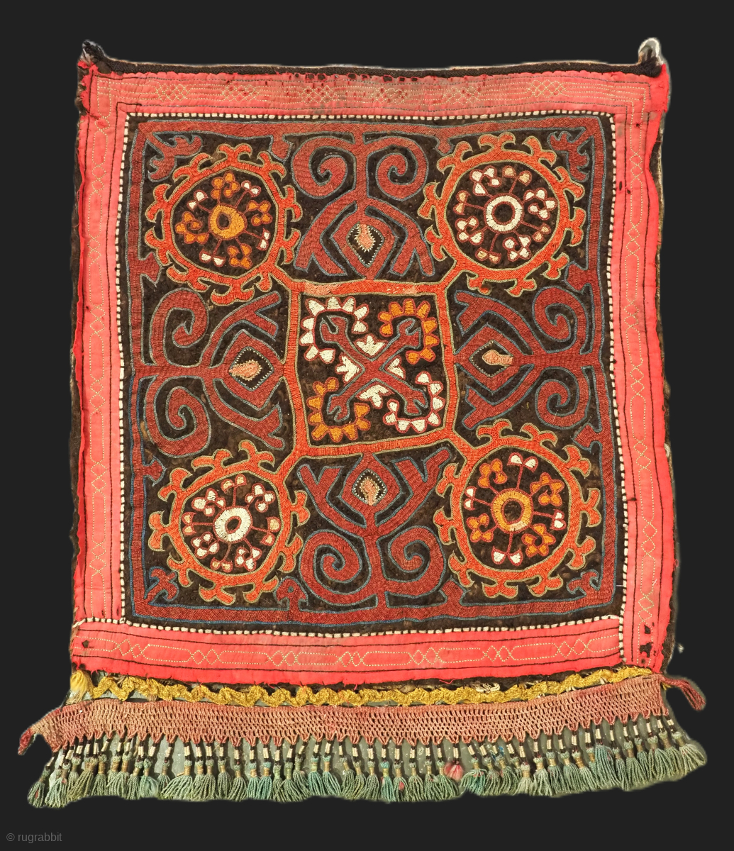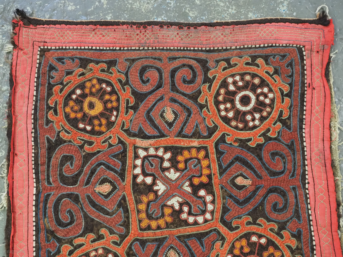 This panel is made of thick hand pressed felt, embroidered with a classic Kirghiz design. Note the applied panel with fringe along the base.