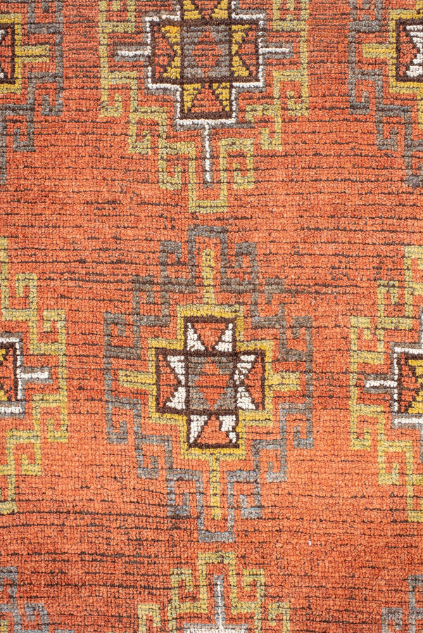 Antique Persian Kurdish Rug, circa 1920. Featuring an allover geometric star motif on a warm coral field with soft ivory and blue accents, framed by simple tribal borders. Bold village weaving with a charming, rustic character.
