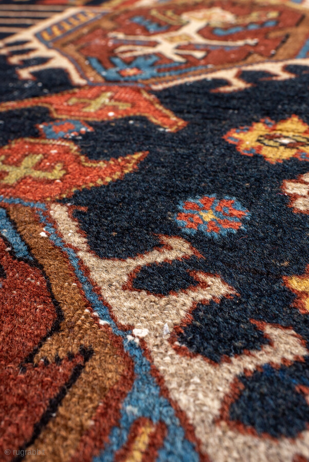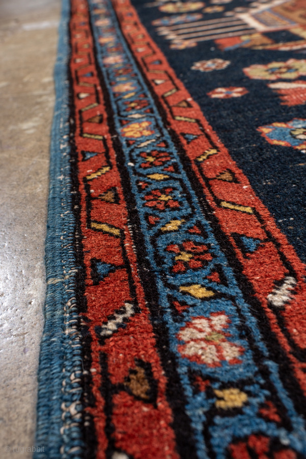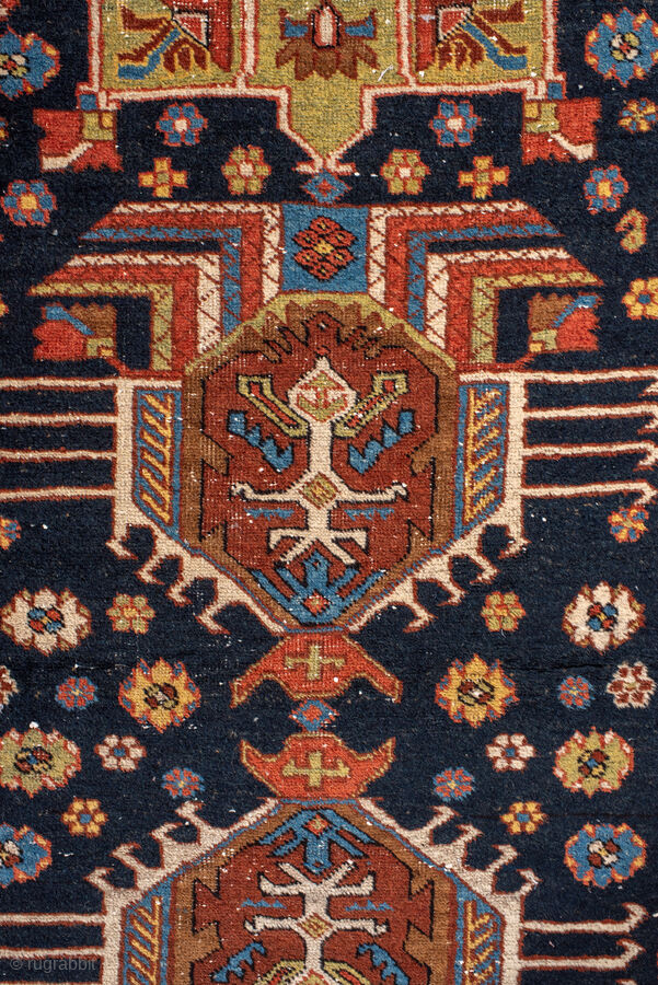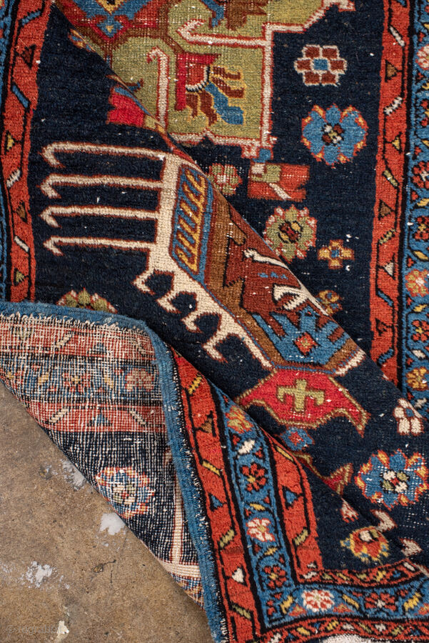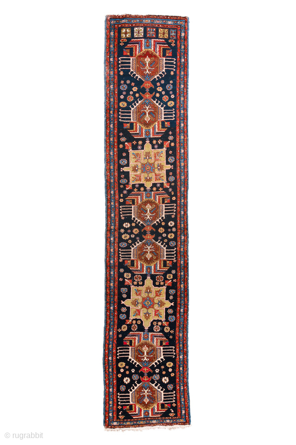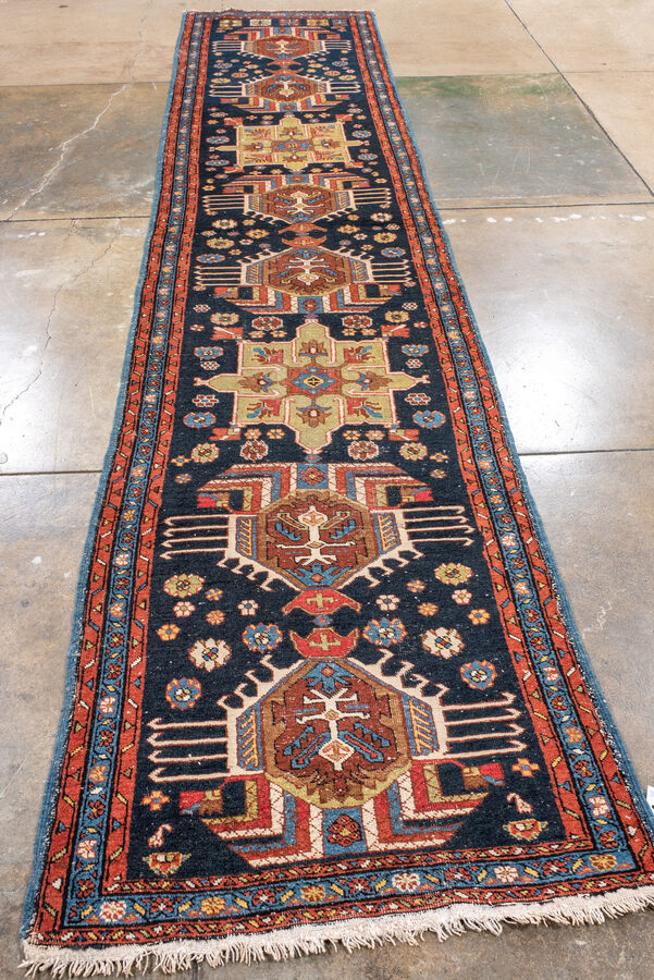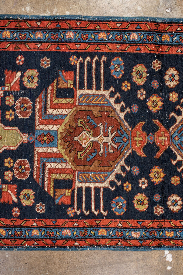 Antique Persian Heriz Runner, circa 1910. Featuring a column of bold geometric medallions on a deep indigo field with ivory and red accents, framed by a classic Heriz border. Strong Northwest Persian village design with crisp, graphic rhythm.