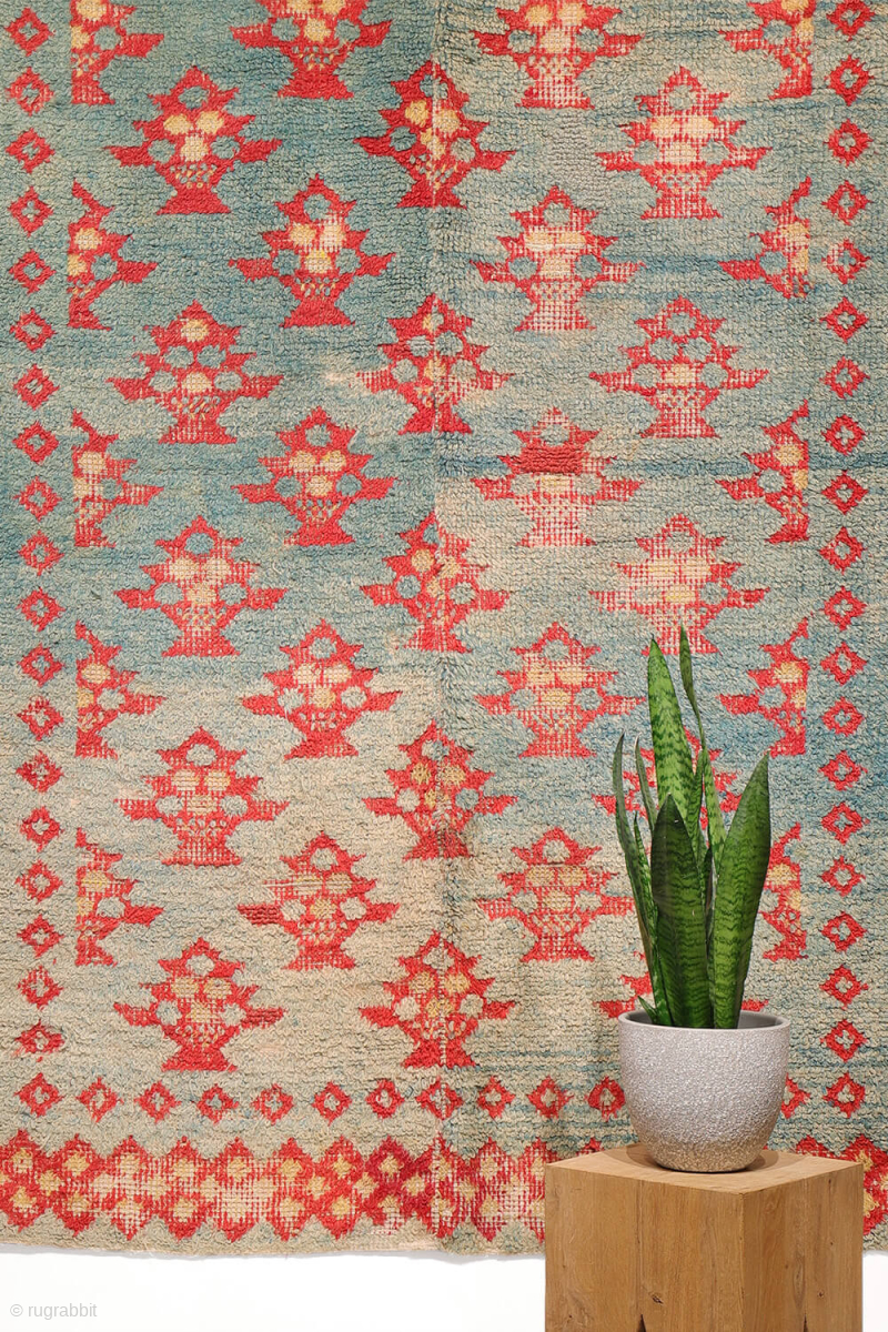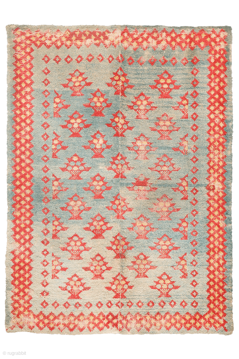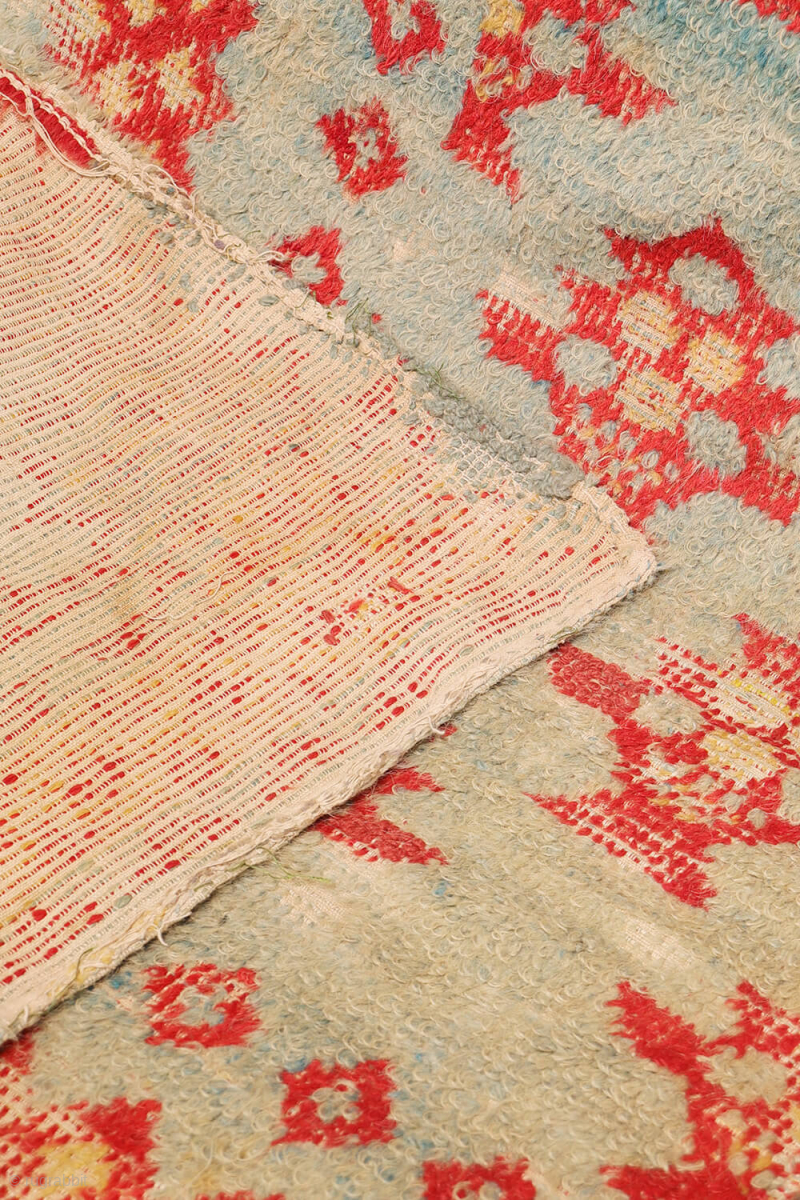 ¡Hola! a rare early 19th century, or even 18th century, antique Alpujarra rug from Granada, Spain, woven with the traditional looped technique on a linen base. It is very rare to find an antique Alpujarran rug with this baby blue colour, which showcases an incredible abrash or colour changes within the blue colour. The blue colour is strongly associated with the Islamic tilework in Spain.