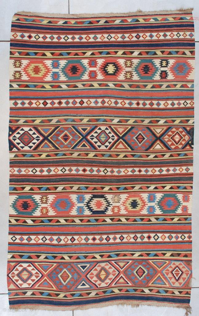 This early to mid-19th century Caucasian (Shirvan) Kilim #7489 measures 5’11” x 9’6” (179 x 292 cm). It is a beautifully drawn Caucasian kilim in striped motif with Memling guls, diamonds, triangles, stripes and solid stripes. This kilim has it all! This is a very large size for this type of kilim. There are four very small areas where the walnut brown has eroded. See the photos. The balance of this rug is in perfect condition. The ends and sides are original. The ends have never even been opened up. I’m pretty sure this rug has never been walked on. It is clean and ready to go.