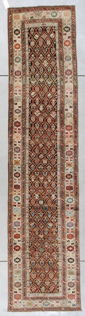 This circa 1875 Kuba Runner antique Oriental Rug #7414 measures 3’2” x 13’2” (97 x 401 cm). This is an interesting long rug. It has a latticework design containing innumerable different flower motifs worked in gold, pale blue, and red on a brown ground which is down indicative of its age. There is lots of asymmetry in design. The border motifs are very interesting. The interior minor border has meandering lazy hexagons filled with different motifs on an ivory ground. The major border is composed of a very well-drawn crab design on an ivory ground. There is a nice pink used in part of this crab border. This is further evidence of the trade between West China and the Caucasus. This crab border is flanked by alternating oblique striped borders. It is very beautifully drawn. The ends and sides are complete. The rug is clean and ready to go.