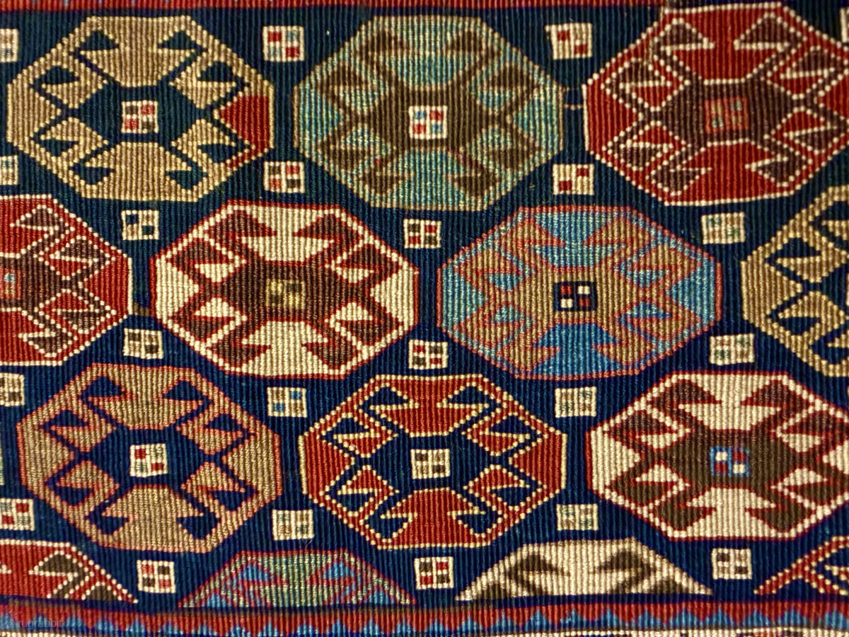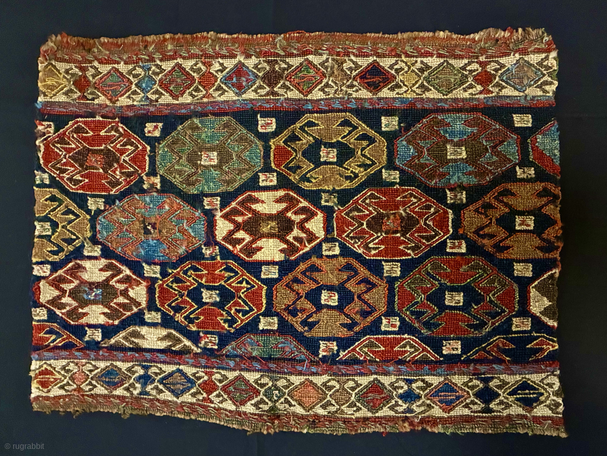 Gorgeous dyes, and also a small fuchsine spot that somehow confirms the dating. Lovely pattern execution.