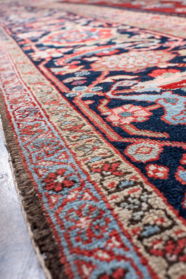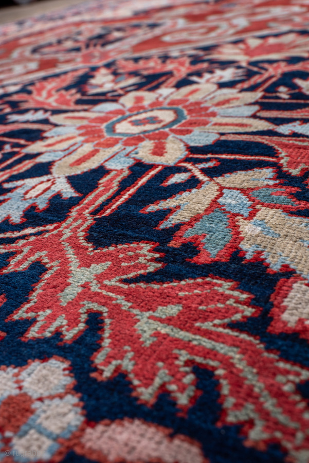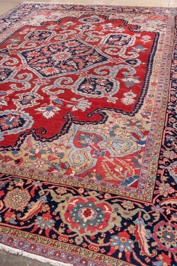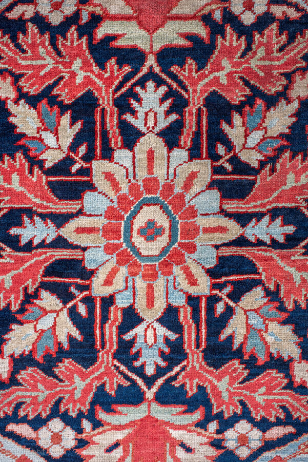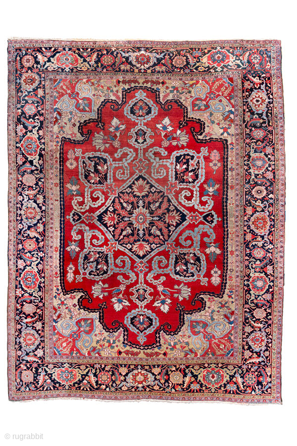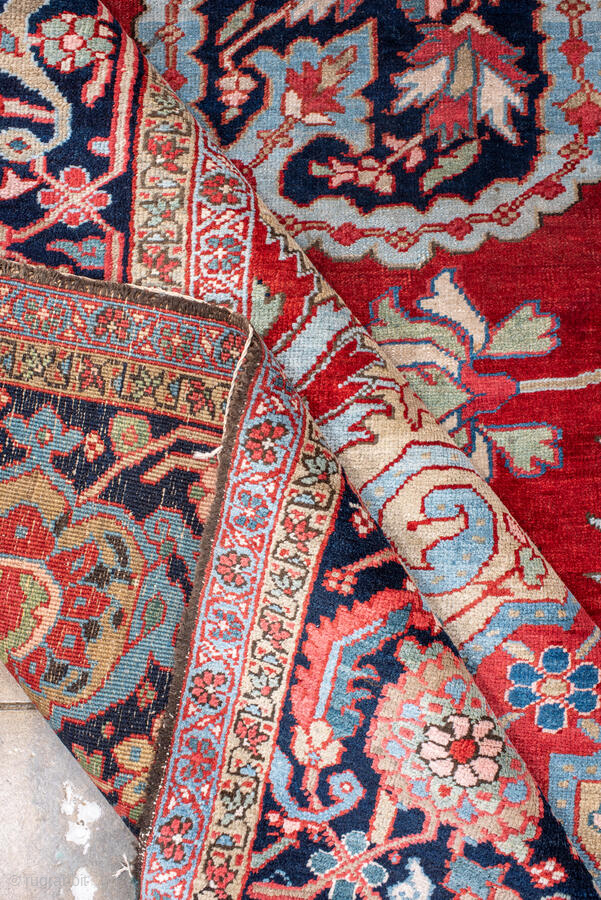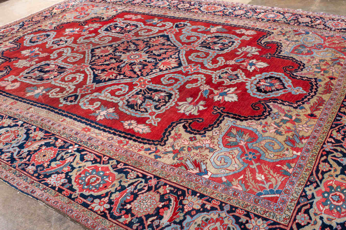 Antique Persian Serapi Carpet, circa 1900. Featuring a bold, stylized medallion on a vibrant red field with soft blue, ivory, and deep indigo accents, framed by a classic Heriz-style border. Grand Northwest Persian design with strong decorative presence.