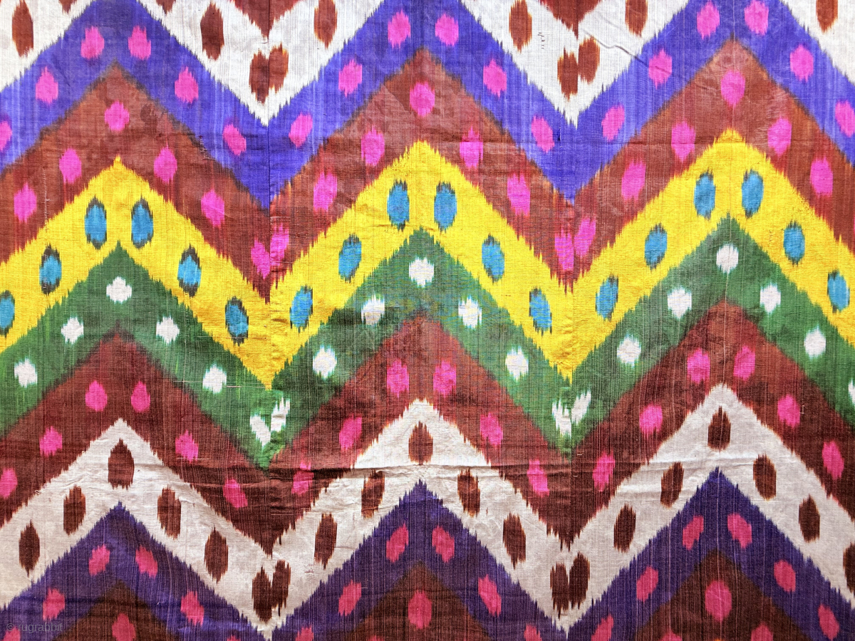 Tajikistan silk adras ikat panel. Amazing saturated colors from natural dyes. İt is in great condition. (63'' x 45'') - (''160 cm x 115 cm''). turkmansilver@gmail.com.