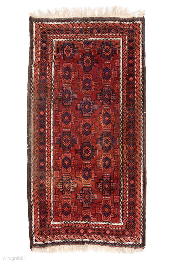 Antique Belouch Rug, circa 1920. Featuring repeating geometric guls on a rich red field with deep navy accents, framed by multiple narrow tribal borders. Compact, finely drawn design with classic Baluch character.