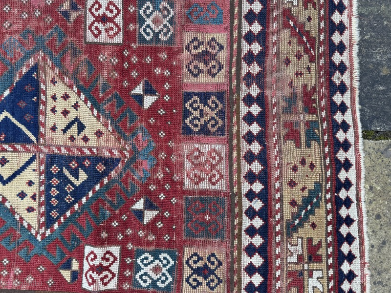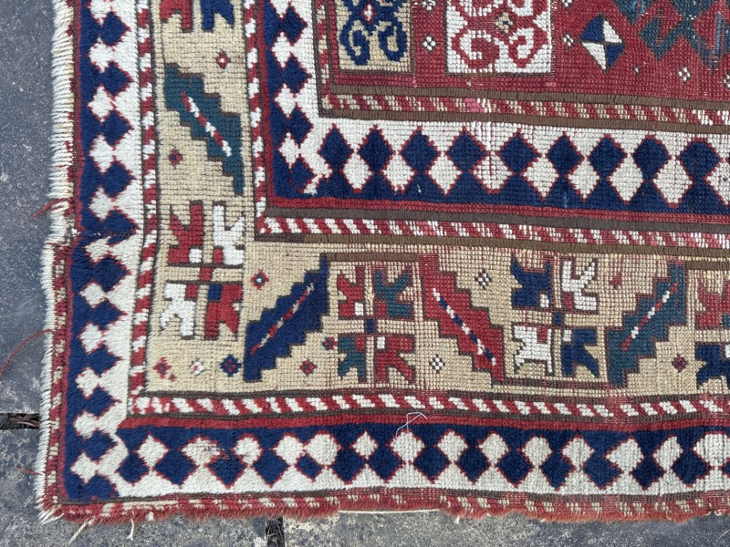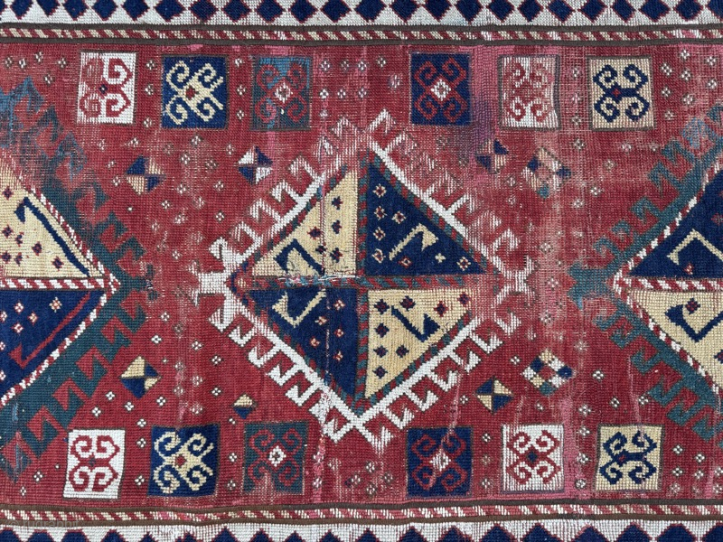19th century Kazak: great colours, classic design, but very distressed condition, reflected in the price