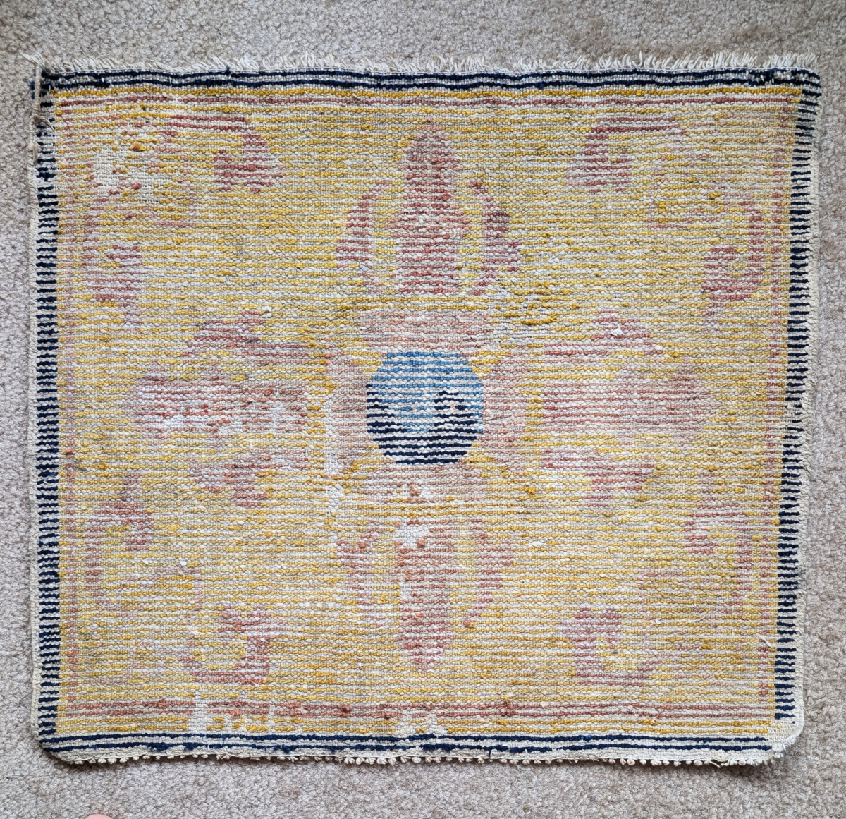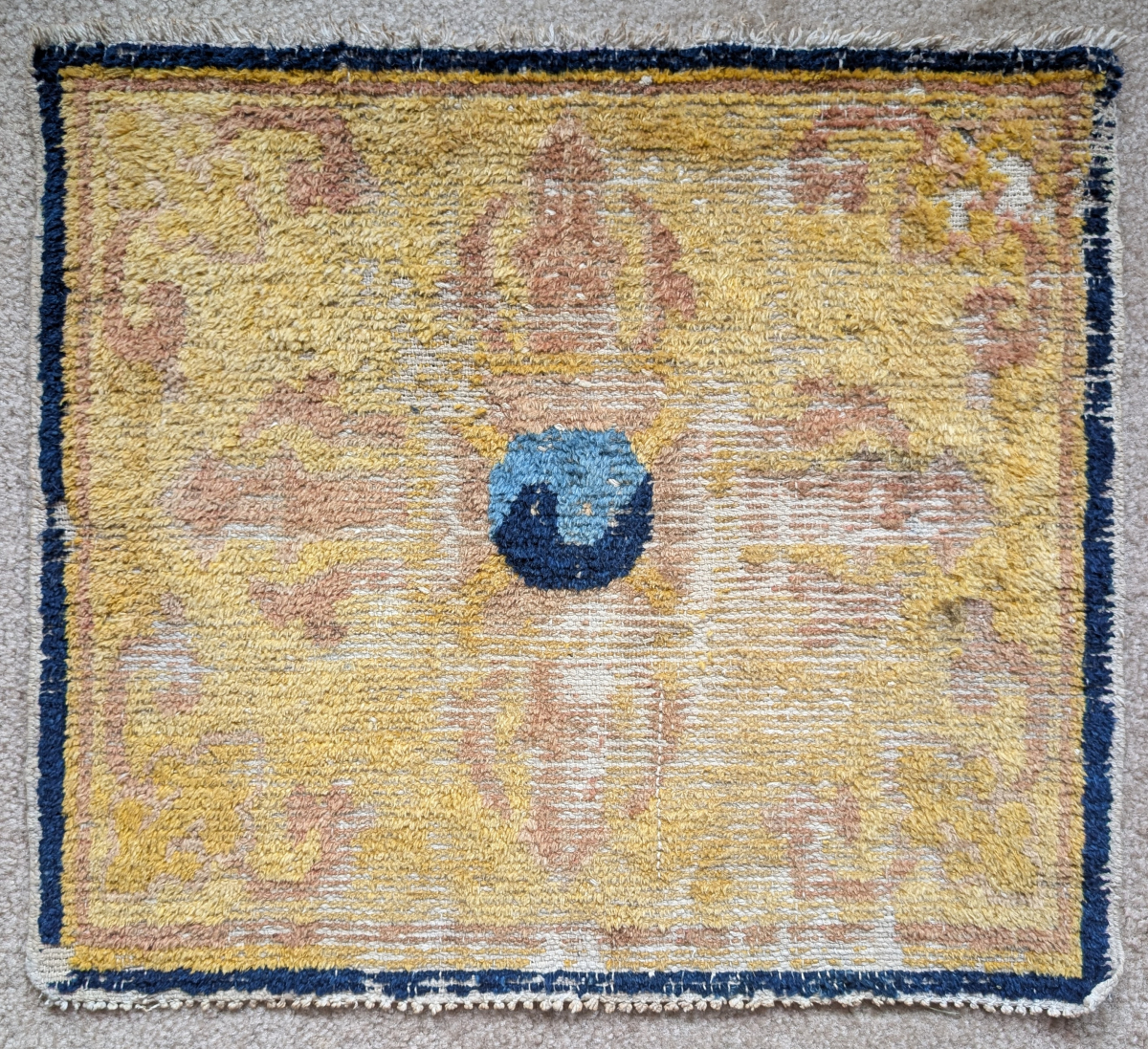 Ningxia seating square with a double dorje / tantric thunderbolt and central yin / yang symbol against an intense yellow ground. Commissioned for a Tibetan monastic patron.Likely 18th century