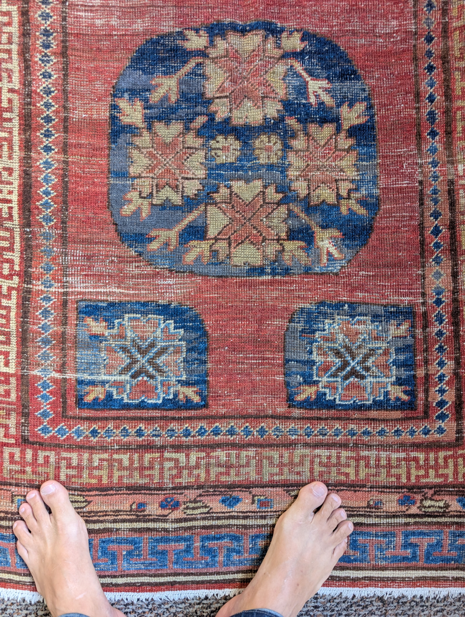 Rare unusual Khotan rug with a seldomly seen central medallion variant and corner pieces. Fret guard border is drawn very freely with little regularity. Worn, scattered repairs,both ends are rewoven.