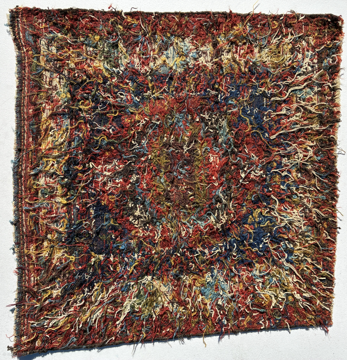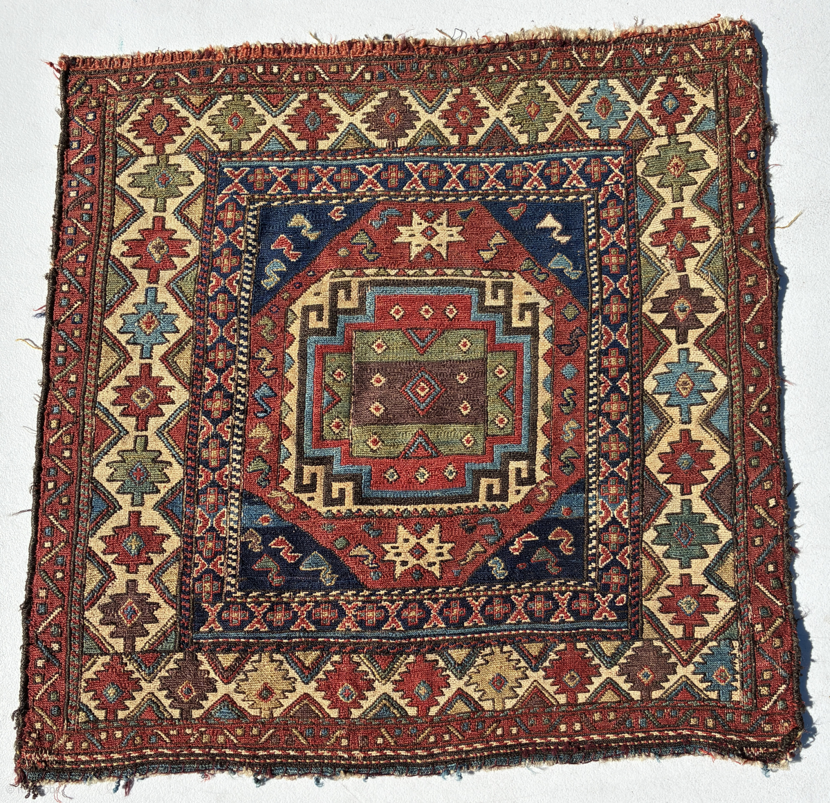 Shahsavan sumak khorjin face, 60 x 60 cms, excellent natural colours and wool, no repairs, the white areas are cotton. Email: peparethos@xsmail.com