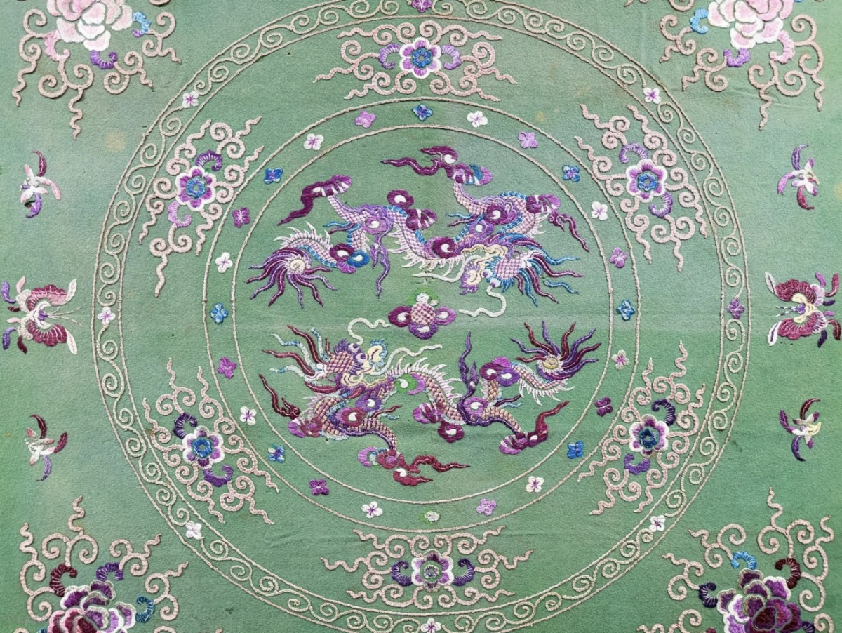 Chinese Silk Embroidered Bokhca & Hanging Decoration. Saturated natural colors. Dragons in fight in center. Few tiny wears. Overal in great condition with printed cotton backing. Size - 48.5'' x 45'' - ''123 cm x 115 cm'' turkmansilver@gmail.com.