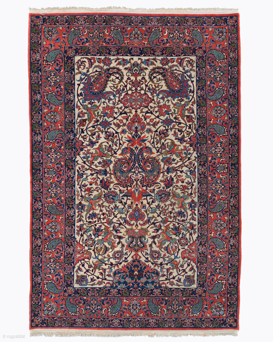 This rare late 19th century Persian Isfahan rug highlights a powerful and rhythmic floral composition featuring a centralized botanical arrangement anchored within a luminous ivory field. This structural balance between the large scale “boteh” or paisley motifs and the surrounding dense field of scrolling vines and delicate songbirds reflects the pinnacle of the Isfahan workshop tradition. Textiles of this era are world renowned for their extraordinary technical precision which allows for the painterly execution of complex curvilinear details and naturalistic forms such as the fluid arabesques and interlacing floral sprays.