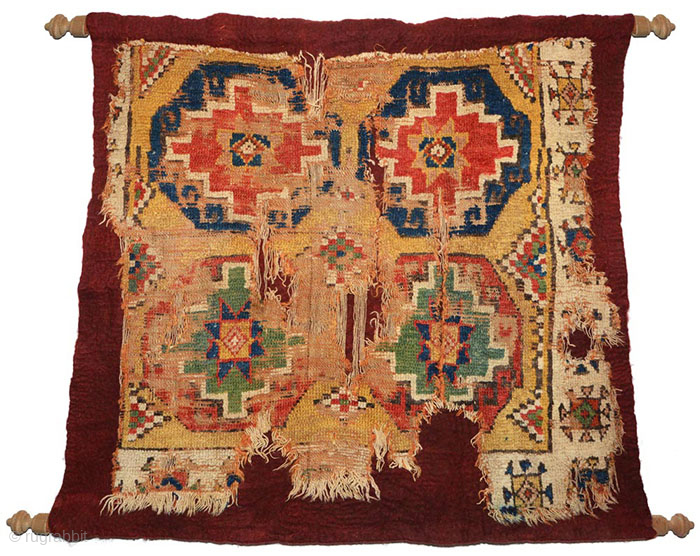 Outstanding eighteenth century carpet fragment from the Cappadocia region of Turkey featuring the so-called 'Memling gul’. This impressive fragment is mounted on an intentionally rustic maroon felt backing the size of which is +/-104cm x 97cm with the fragment size being about 94cm x 85cm, has all natural dyes, handspun wool warp, weft and pile, and was made sometime in the 1700's. The deep rich colours, super-fine handspun wool and the still well defined and essentially intact guls make this very old fragment a real collectors piece. For more information and photos please see https://warpandweft.club/portfolio-item/afghanistan-central-asia-item-36/