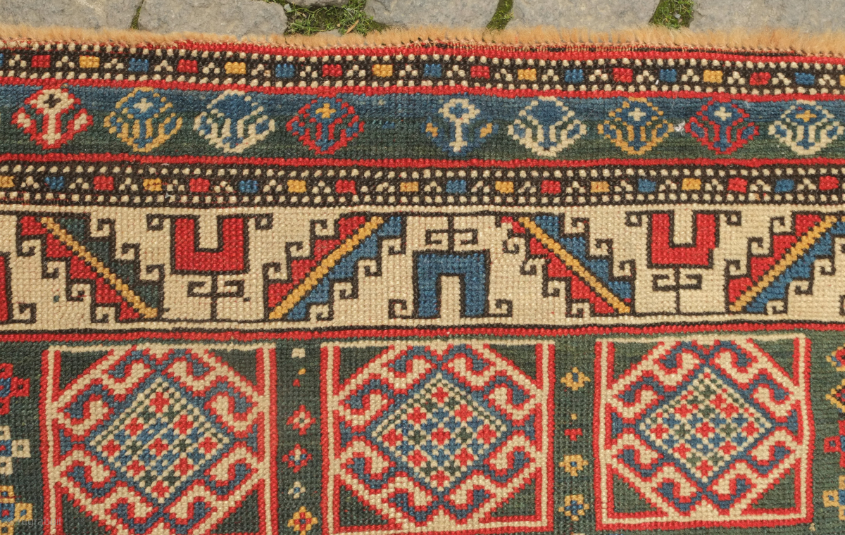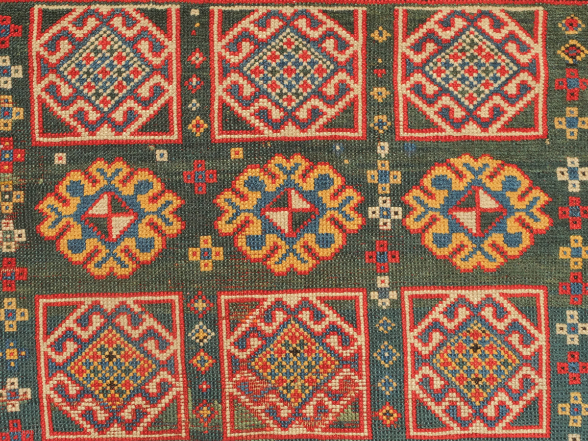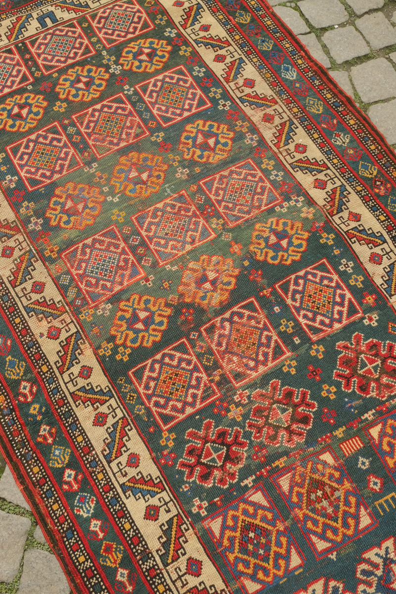 Genje green ground rug, 19th century. Wonderful large florets and hooked medallions in the field. Some old repairs here and there. Some lower pile areas. 94 x 180 cm
