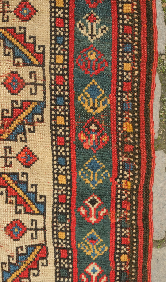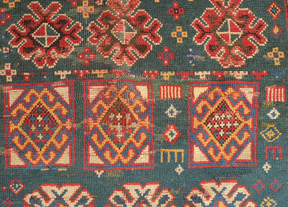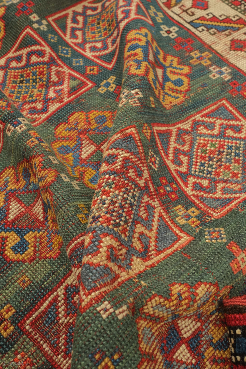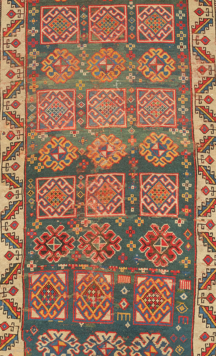 Genje green ground rug, 19th century. Wonderful large florets and hooked medallions in the field. Some old repairs here and there. Some lower pile areas. 94 x 180 cm