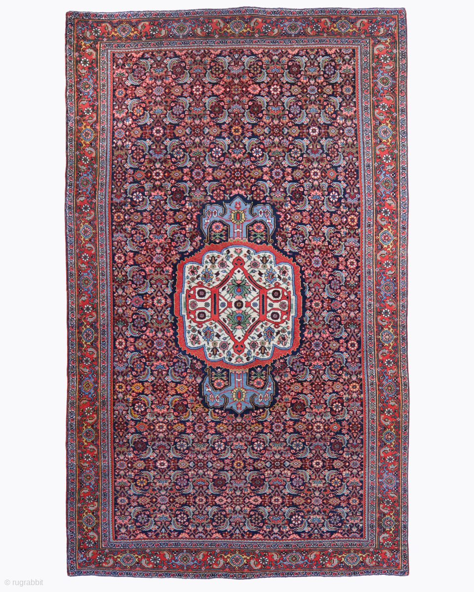 This rare late 19th century Persian Bidjar carpet highlights a powerful and rhythmic floral composition featuring a centralized multi-lobed medallion anchored within a dense “Herati” or fish-pattern field. This structural balance between the ivory and madder red medallion and the surrounding midnight indigo ground—filled with repeating floral rosettes and serrated leaves—reflects the pinnacle of the Northwest Persian weaving tradition. Bidjar textiles are world renowned for their extraordinary technical precision and “iron-like” durability, representing a distinct artistic language developed in the Kurdish region of Persia.