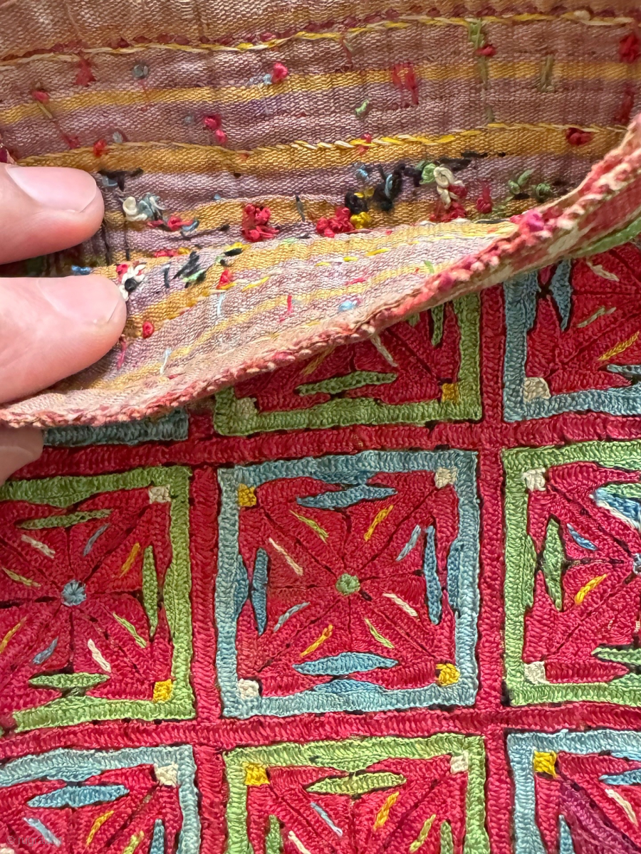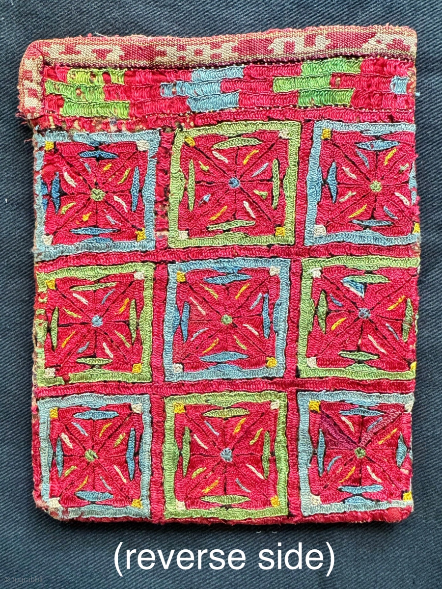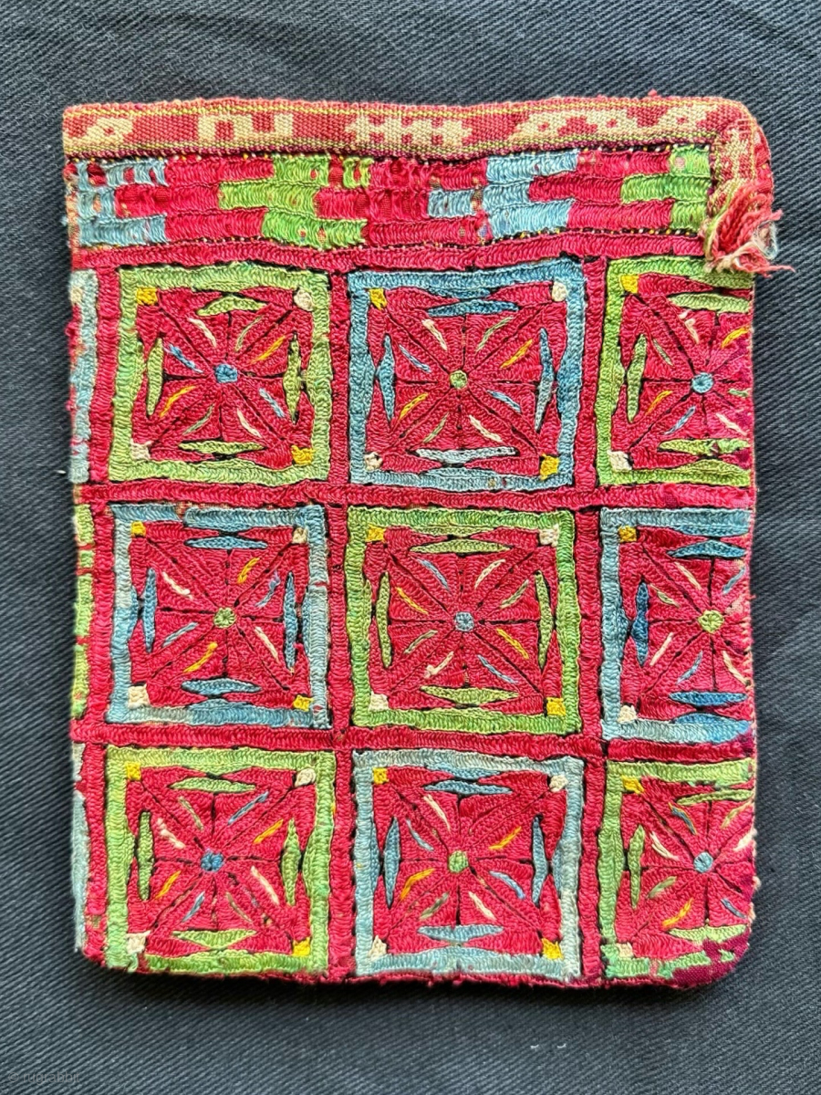 An outstanding Antique Turkoman / Turkmen Ersari tribe silk embroidered bag pouch dating to 19th century. Out of most central Asian silk bags, the Ersari types are some of the finest and visually interesting. The example is as good as it gets. The colours are phenomenal all primary and derived from natural dyes. We have lush red, blue, green, yellow and white all fighting to bring out the design. The quad rams horn motif compartmented in alternate colours is relatively rare design to see in such bags and is visually dazzling. The stitching of the silks is extremely fine and both sides are fully embroidered. It is a brilliant example of its type and would add nicely to any top tier collection. In very good shape. size: 19cm x 15cm (7.5"x 6")…. …. (If you message via rugrabbit and don’t get a response within 24 hours, then your message hasn’t got to us so please email directly to: istalificollections@outlook.com.