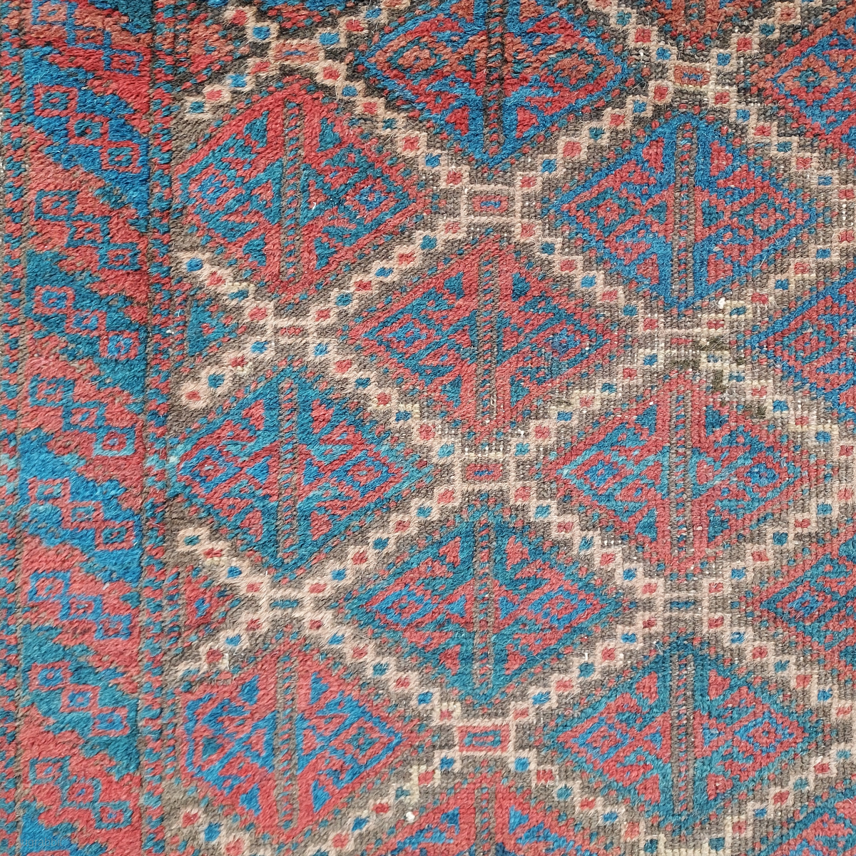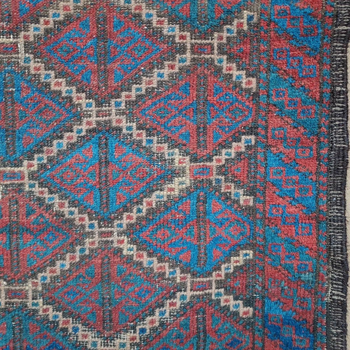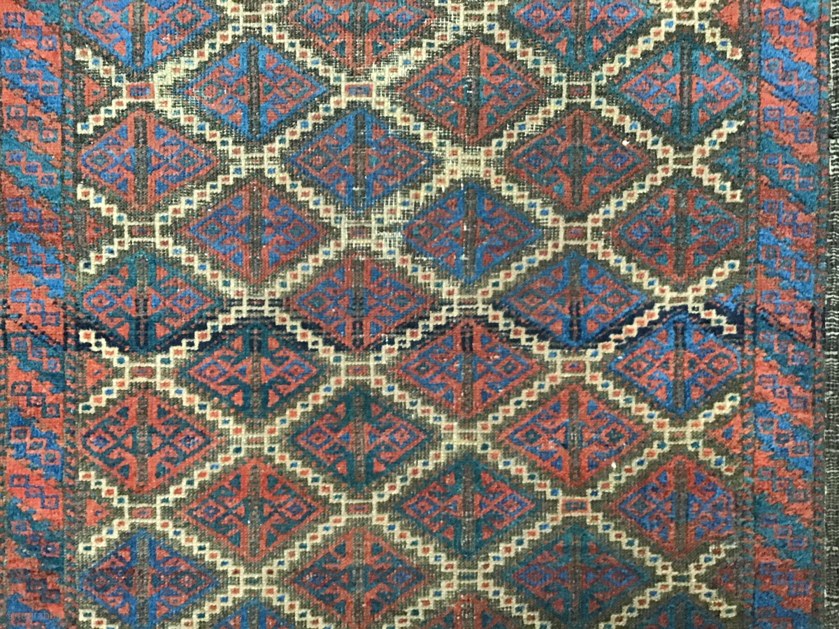 Antique Baluch small rug: Geometric Gul motif in Diamond Lattice repeat with crisp camel hair stepped outline. 33 x 58 inches. Brilliant blues. Very good condition. Inexpensive. johnbatki@gmail.com