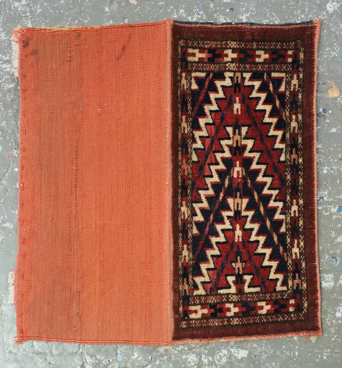 a small spindle bag complete with plain weave back, these bags known by the Turkmen as 'Igsalyk' were hung inside the yurt and used to store items used in the hand spinning of wool. The design to the face is the well known Turkmen tree design.