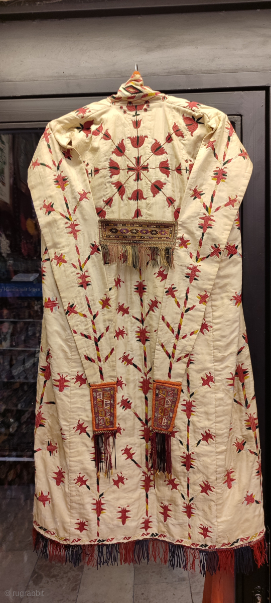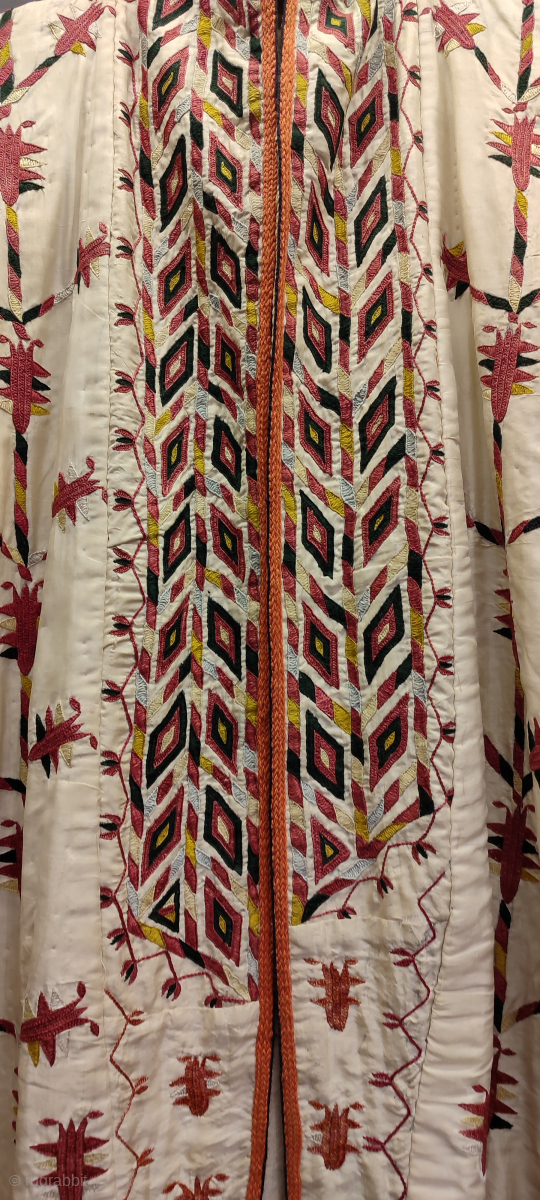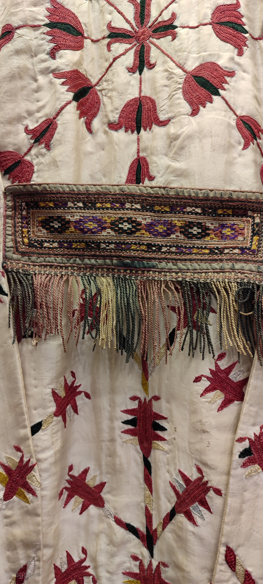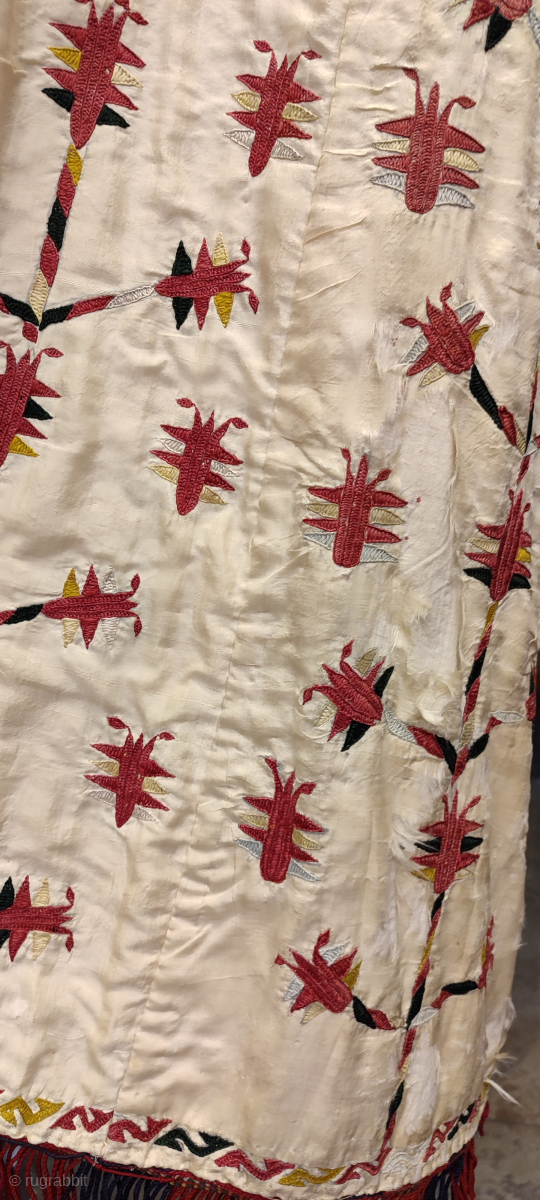 Turkmen vintage white chirpy. Some damages on the white silk background material.