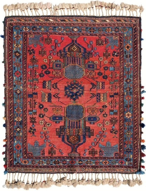Soumak,Soumakh,Sumak,Sumac,..a nifty little one. Afshar ? 110 x 120 cm. ( 3,6 x 4 ft.) Antique . a Mirrored two vased field filled with floral vines and motives. And a bright blue flourishing main border. Original top and bottom ends, and also guard borders." 825,oo euro ex transportcosts. Origin Unknown. Listening, The Chemical Brothers "The Golden Path". .
