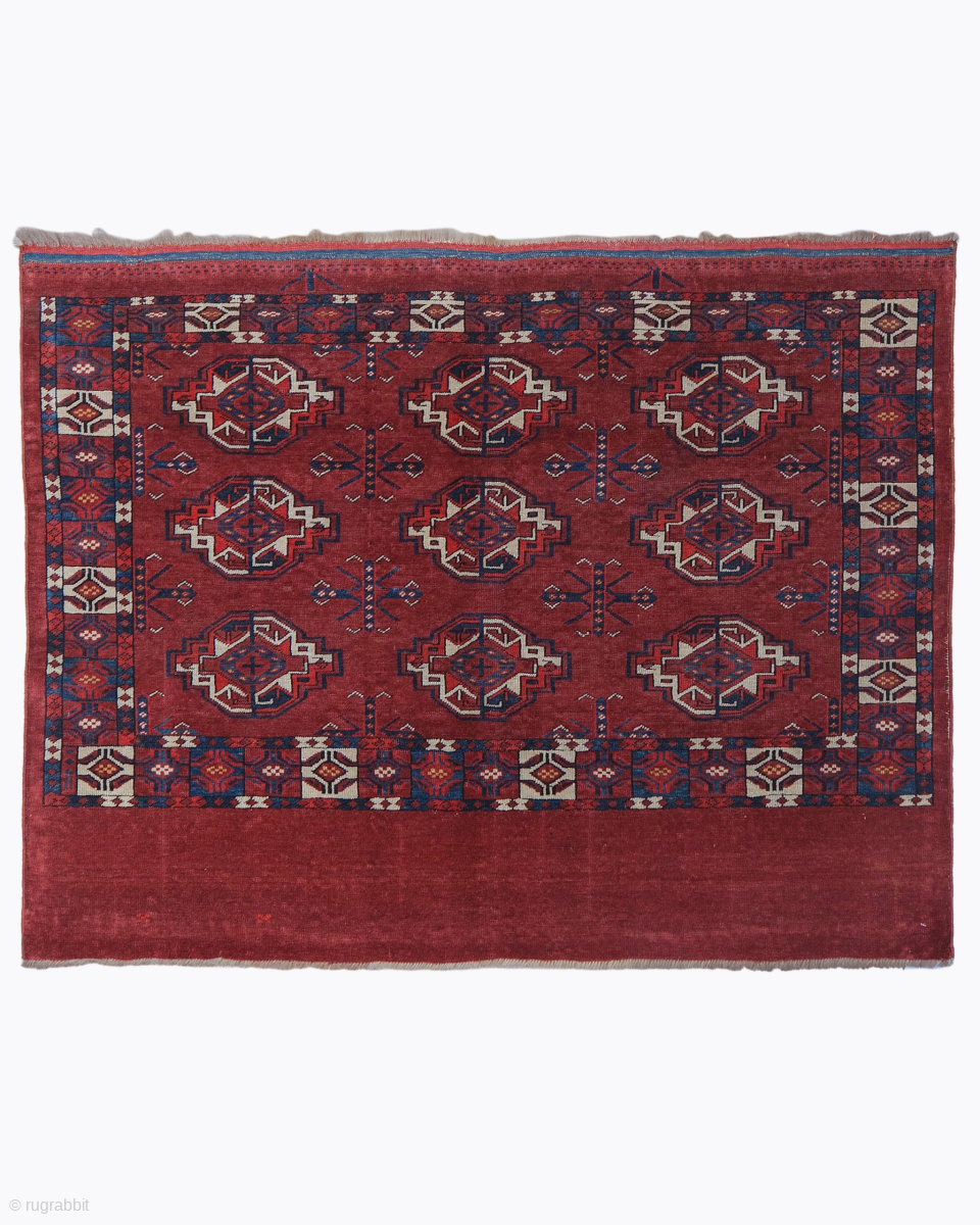This rare mid 19th century Yomud chuval highlights a powerful and rhythmic geometric composition featuring a classic 3×3 grid of large-scale “chuval-gul” motifs anchored within a deep madder red field. This structural balance between the primary stepped octagonal guls and the surrounding “chemche” minor motifs reflects the pinnacle of the Turkmen nomadic weaving tradition. Textiles of this era from the Yomud tribes are world renowned for their extraordinary graphic clarity and the use of a sophisticated tribal vocabulary that represents a distinct artistic language developed over centuries of Central Asian heritage.