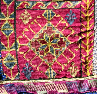 Swat Embroidered Textile, yoke from a child's top. This is an excellently rendered child’s yoke from Swat region, executed in tiny cross-stitch embroidery. The front is 10.5 inches wide and 11 inches tall in the front. Most of the front and the wrap around ties at the bottom are expertly embroidered in tiny cross-stitches to wonderful effect. The colors include green, yellow, navy, light blue, yellow, purple, burgundy and orange. See the close-up photos to see the fineness and colors of the small stitches. There are strips of metallic thread embroidery work in the center and across the top of the yoke. Beaded collar. Excellent condition. The back is a simple cotton print. Great designs and execution. www.banjaratextiles.com