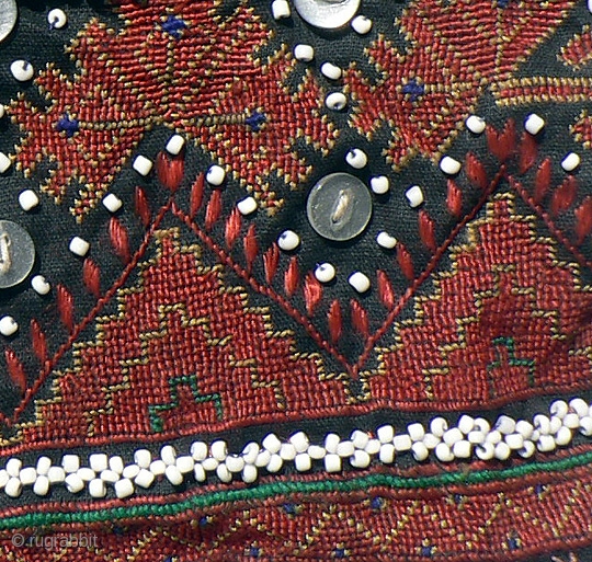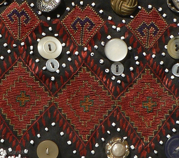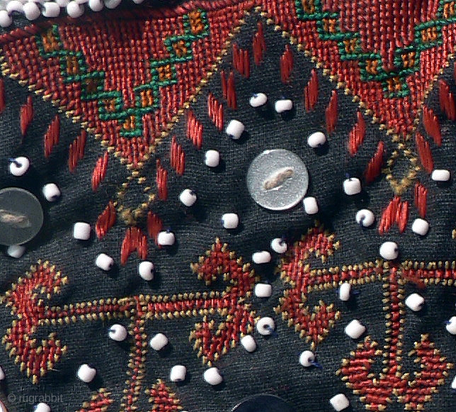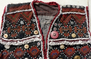 Indus Kohistan Child's Vest. Finely embroidered in tiny cross stitch and flat stitch, with intricate beadwork, baubles and buttons, demonstrating the mother's skill and love for her young child. Early to mid-20th. 17 inches tall by 14 inches wide when closed. Excellent condition. www.banjaratextiles.com