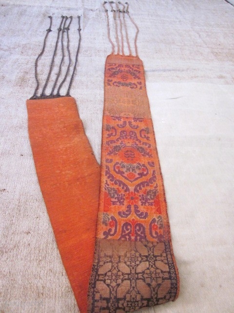 Beautiful Moroccan brocaded wedding belt from the late nineteenth century. This belt is composed of five brocaded woven part : golden thread on salmon, golden thread on dark blue background, and red, green, orange and purple brocaded silk on salmon background . Each end of the belt have four long corded fringes with trimmings and silver sequins. The side edges are sewn with cotton thread on one side and cut to the other side (as velvet). Very good condition.