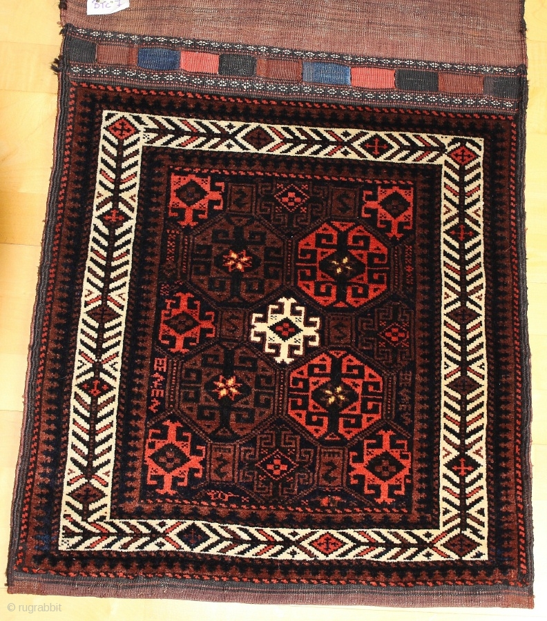 Baluch double bag; end of 19th c.; 65 c 166 cm (2`2” x 5`5”), front sides in perfect condition with glossy wool and extremely precise knotted, in each motive one knot (silk?) in Purple and Meder stars are made in light yellow, both may give a good indication of its age; design known from known Baluch collections (Boucher, Wisdom etc.) here as double bag (loops for closure are missing) which seams to be seldom to find; in same high quality as described in mentioned Collection pieces; bag was used as it has repairs on its Kilim back side, two nice little double-head-animals on monochrome back side, maybe a sign from owner; a “show-piece” which was also an important piece for the weavers?