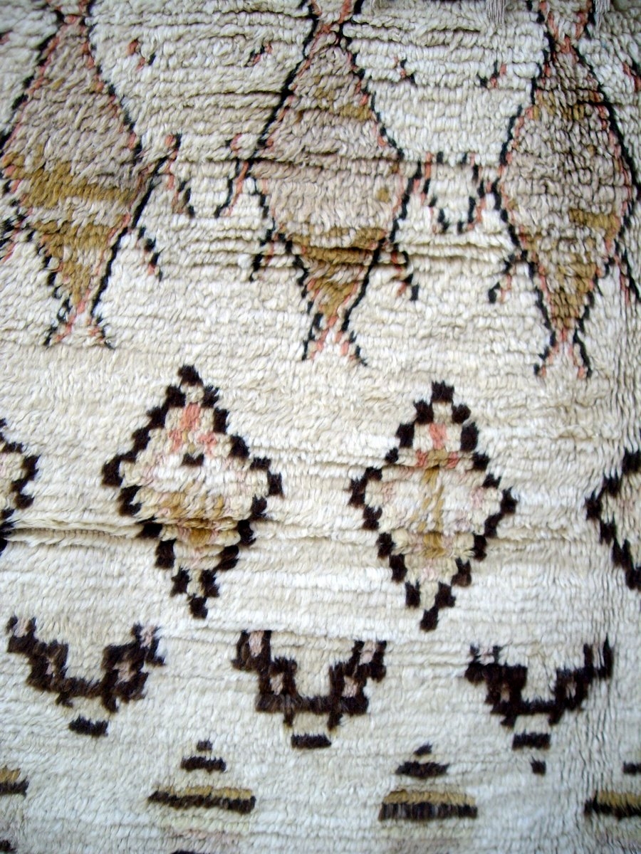 moroccan middle atlas berber rug which falls under the Beni Ourain group and is probably the work of the Ait Youssi tribe. It has silky undyed wool and delicate highlights of most unusual gold and terracotta. Reference 2284. Size 234 x 147cms. 7ft.8in. x 4ft.10in. Euros 1,850.