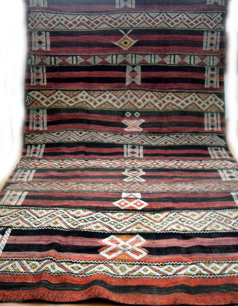 moroccan middle atlas berber flat weave/kilim which dates from the first half of the 20th century. It originates from the Beni Mguild Berber group in the northern section of the Middle Atlas mountain range. Flat weaves such as these are known as "hanbels" and are often used as covers. Ref. 2235. Size 258 x 148cms. Euros 950. sold. thank you.