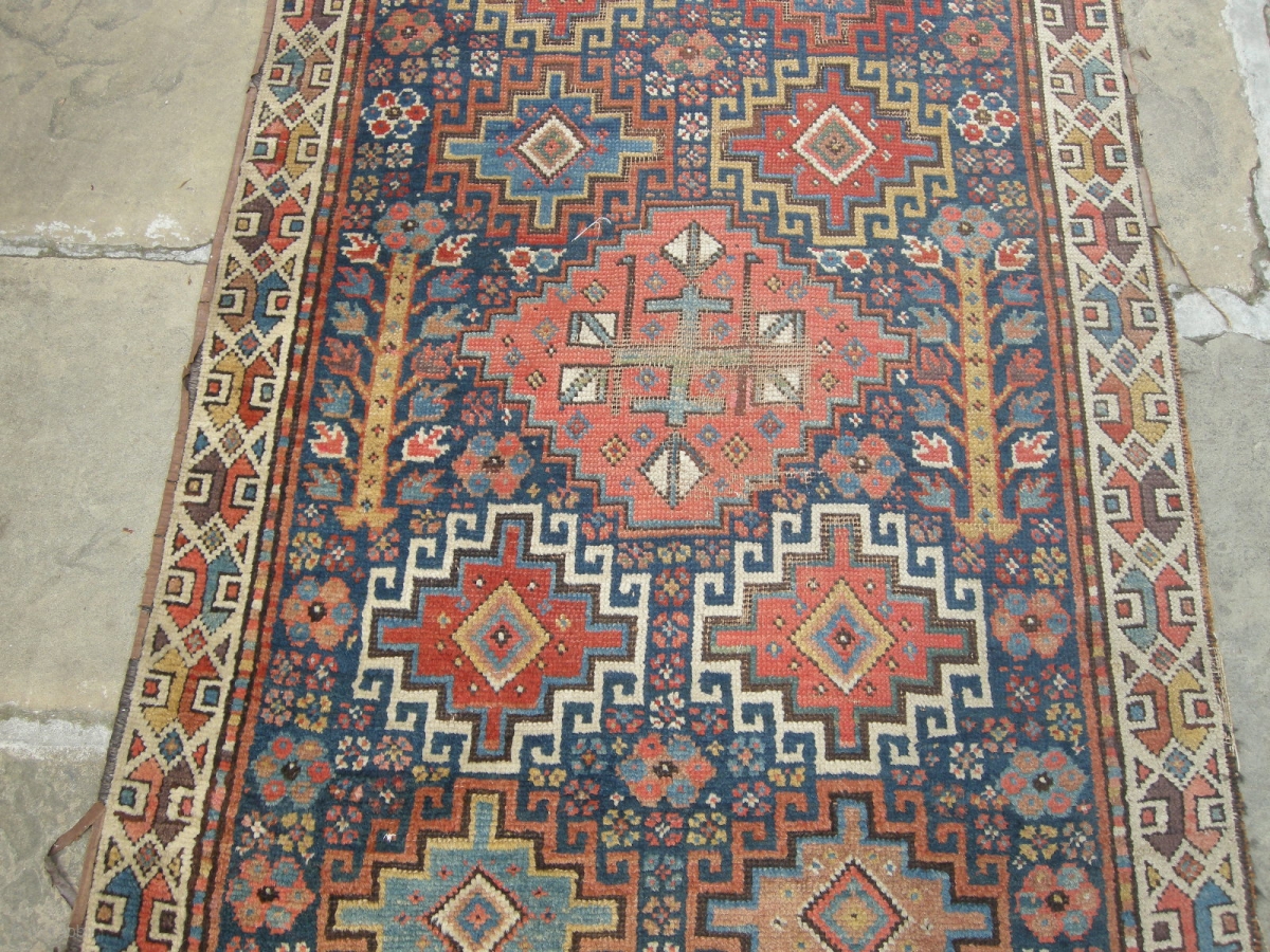 a very beautiful mid or early 19th century nw persian ?kurdish runner. Approx 15ft x 3ft. i think it's missing an outer guard there are condition issues. Low parts two very old small repairs to corners and small holes. It's very dirty but has a greeat design and a superb range of colours including a good aubergine colour.