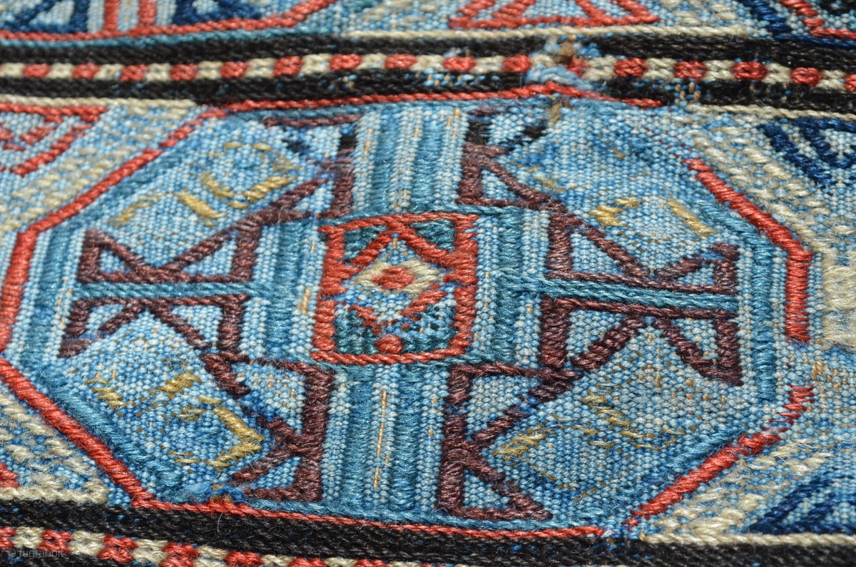 Soumac bag face, not sure if this is faded to pale blue, as the back is completely bold, or if there was some type of wash put on this piece. Measures 34" x 30"