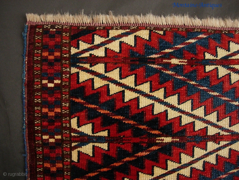 Yomud-- Ok Bash-- 1 ft 9 by 1 ft. 10 Inches. Might have originally had serrated points on one side. Exceptionally fine quality weave as you can see from the back. This is real supple and silky little thing. Frosty pile which is great to the touch.