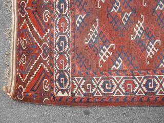 a good late 19th century Yomut carpet approx 9ft6 x 5ft6. Generally sound condition, some low area to the centre and damage to one end, can be repaired or used as is. original condition has the original hanging ties at one end. Fresh to the market priced for a quick sale.
