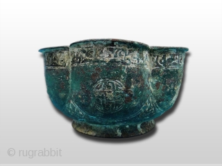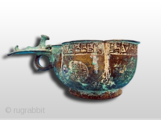 Of shallow rounded from with eight radiating lobes, a ring handle carved lion . each lobes of the cup inscribed kufic and around the rim of the cup kufic inscription .