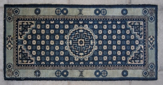 No.R148 * Chinese Antique “Chrysanthemum + Ball Flowers” Rug,Age:19th Century.Size:63x129cm(25"x51"),Origin: Baotou-Suiyuan. Shape: Rectangle,Background Color: Blues.