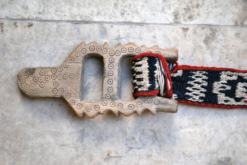 Bakhtiari pack band with carved wodden lock and a rich variety of archaic and characteristic motifs. 5 x 830 cm. (2" x 27'8"). Well preserved in general with very few slightly damaged places (see detail pic)