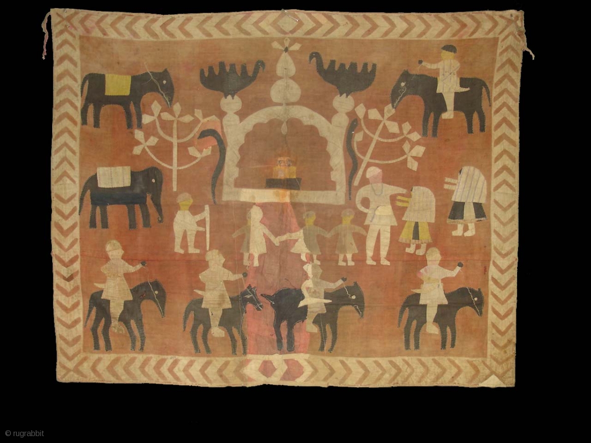 Kanduri shrine Applique Wall Hanging.It is Presented by Pilgrims as on offering on the grave of the Muslim Prince Sara Masoud.From Madhya Pradesh,India.Very Rare And Different Subject of Kanduri Wall Hanging.Its size is 96cm x 116cm(DSC03103New).