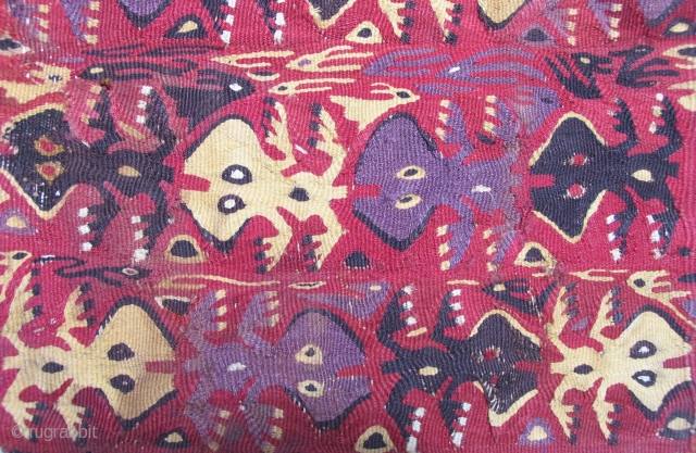 Busy little frogs. Pre-Columbian tapestry woven amphibians. Peru, Pachacamac/Rimac cultures.1000 to 1476 ad. Size: 13 x 16 inches.