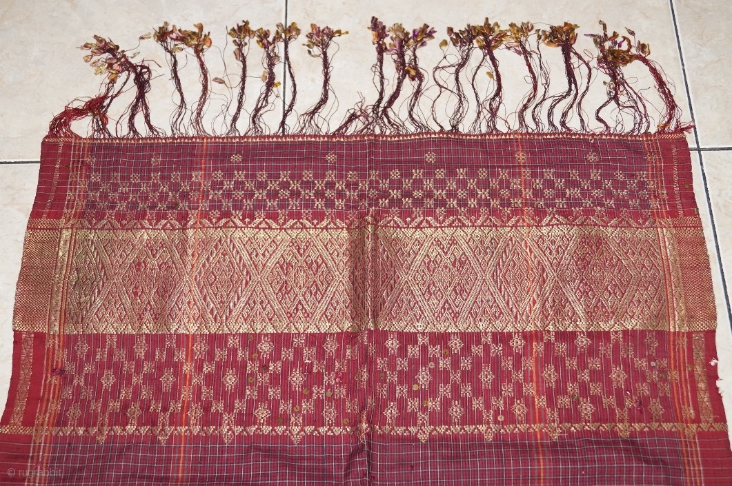 #rb 040 Minangkabau head cloth / shoulder cloth, Minangkabau people west Sumatra Indonesia, late 19th century, silk gold threat supplementary weft weave natural dyes, good condition with holes and re stitched please see picture detail. size: 160 cm x 62 cm