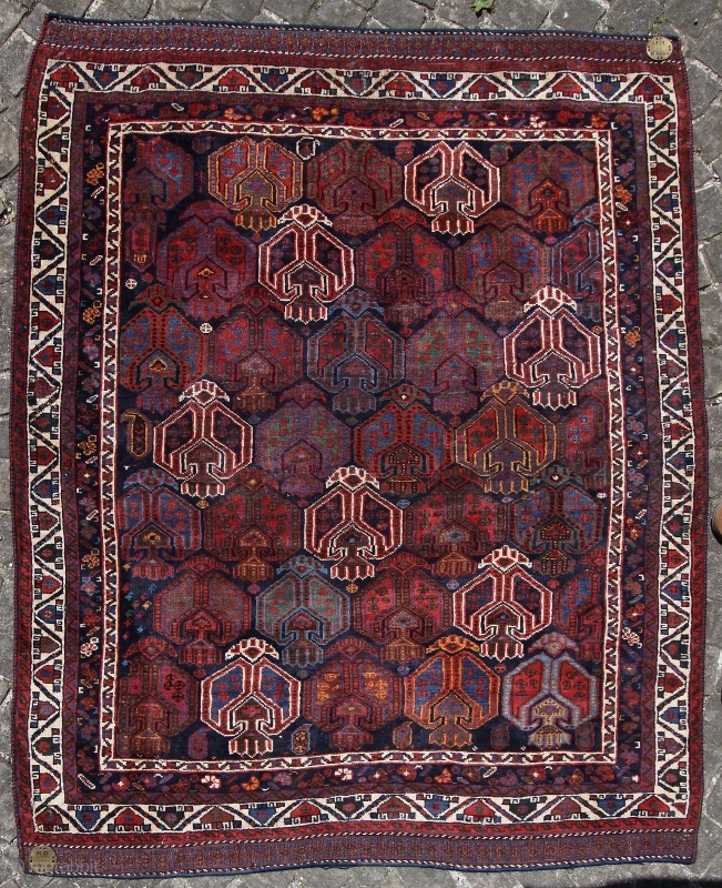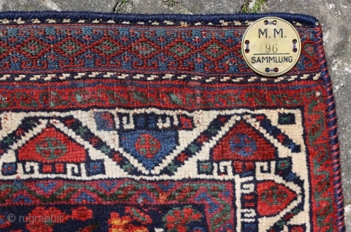 Afshar rug; around 1875; well known design known from Afshar bags, never seen a rug with it; i bought this Afshar direct from the well known collection from Meyer-Müller Zurich/Switzerland. This rug is listed in a book “Der Orient Teppich” Meyer-Müller wrote in 1917 on page 32 as number 6633 as a Schiras 121 x 145cm. i think Schiras fits with Afshar (book is included in this offer). Size is 143 x 119 cm ( 4`8” x 3`11”); on top and bottom each a stripe of Soumac 5cm (2”), rug has no fringes; sides are probably renewed; nice colouration (8 or more)with beautiful wool, very good condition with 5-6 repairs in “coin size”, means some knotted are replaces; rug has red weft; knot density is 1575 per qdm (45 x 35) or (99 per sq.in (11x9)),warp is slightly depressed. On back side is original collection number sewed, the black stripes i sewed on the rug to fix it on a frame (means they can be demounted).
