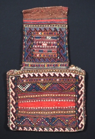 • Size: 2ft 6in x 2ft 0in (75 x 60cm). Antique Baluch storage bag with weft work design. Circa 1900. This fine storage bag (possibly once ... read more